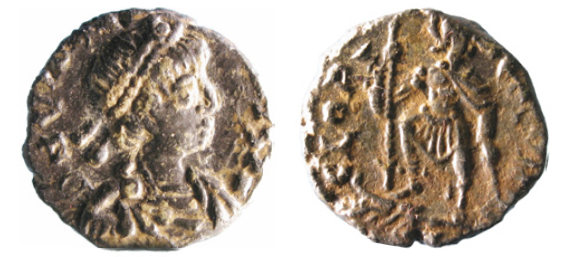 Among the many artefacts discovered in the ruins was a cache of 873 coins wrapped in cloth and hidden in a cheap pottery jar. Examination of these coins show that they are low-denomination nummi made of copper and bronze, with issue dates ranging from Claudius (41 to 54 AD) through to Valentinian III (425 to 455 AD.) It was not uncommon for old copper coins to circulate for centuries during the Roman empire, such was their low worth and limited propaganda value.