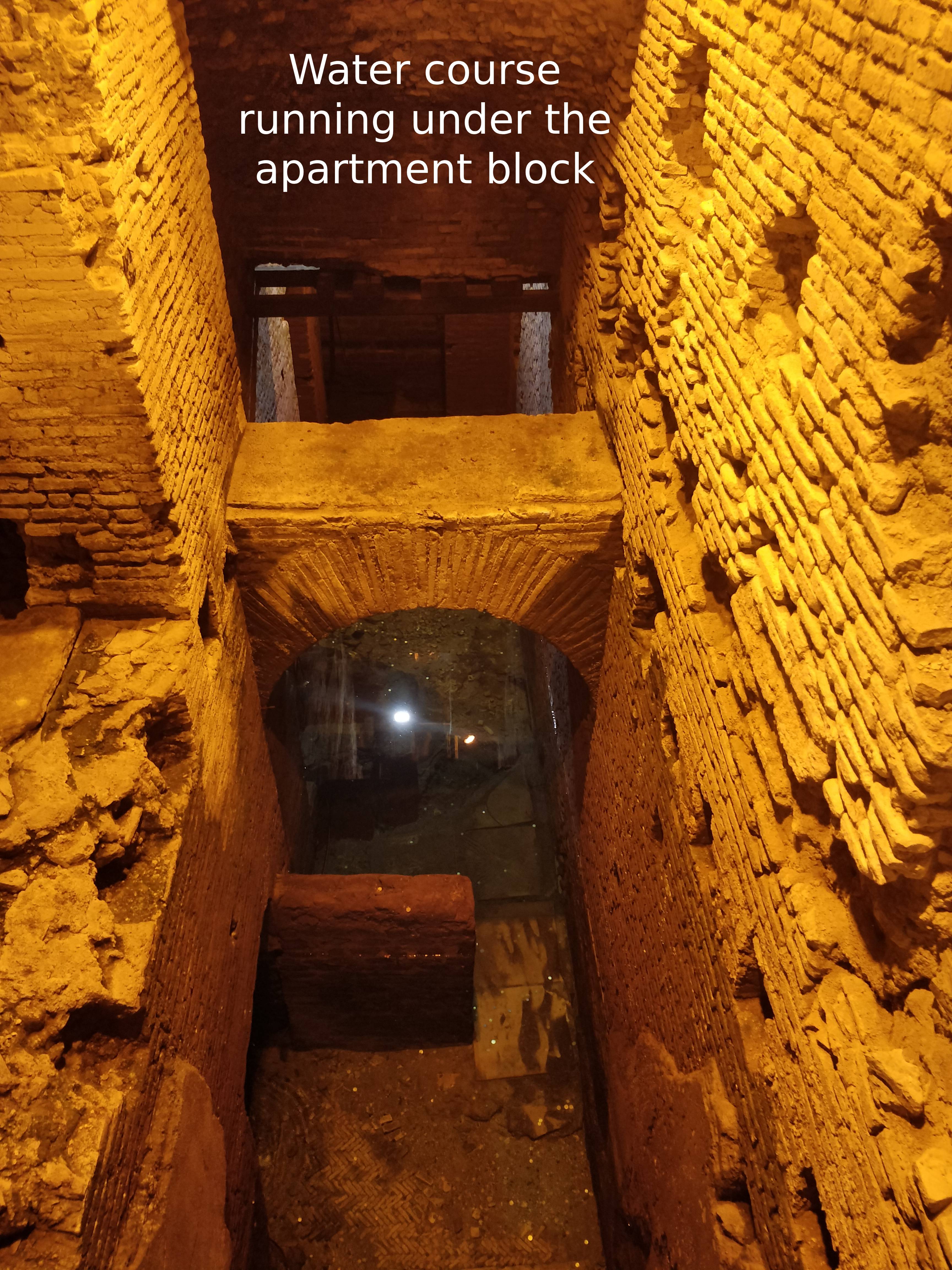 In the late 1990s, building work in the heart of Rome brought to light some fascinating ancient ruins. Known today as the Vicus Caprarius (*), the complex lies ten metres underground only a few yards from the world-famous Trevi Fountain. Opened to the public in 2004, the site contains two major constructions: the remnants of the Aqua Virgo, the last functioning aqueduct from ancient times; and the foundations of a luxurious town house built on three levels, now buried under sixteen centuries of development above.
